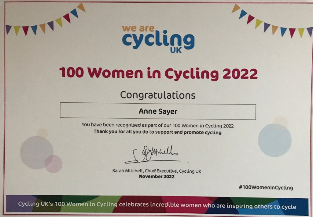 I was delighted to be named one of Cycling UK’s 100 Women in Cycling 2022 this month!
